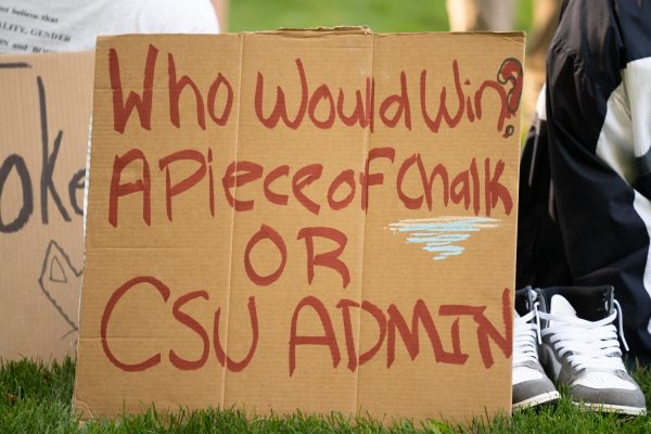 Earlier in the day on Oct. 8, CSU hosted its annual Fall Address and University Picnic event on The Oval. A handful of students showed up with signs that read, “Does my chalk hurt your ego?” and, “Who would win? A piece of chalk or CSU admin?”