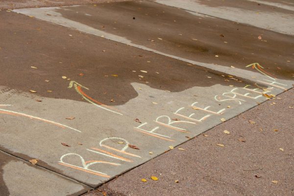 Colorado State University senior Amber Wright sat on the Lory Student Center Plaza Oct. 7, chalk in hand, surrounded by puddles of water, colorful smears and the remnants of chalked messages. She drew arrows pointing to the puddles, accompanied by the bright orange words “RIP Free Speech.”