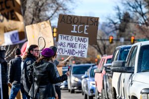Danny Hesser, a Colorado State University alumnus, waves a flag to support the anti-ICE demonstration on College Avenue Jan. 30. “I feel that even CSU has caved to some pressure from this administration as well,” Hesser said. “I really want to see CSU step up and be an example of how, at the academic level, a university can fight back.”