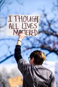A protester holds up a sign reading, “I Thought All Lives Mattered,” to demonstrate against ICE on the side of College Avenue as part of a national protest against ICE Jan. 30.