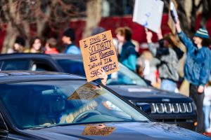 A person drives by an anti-Immigration and Customs Enforcement protest holding up a handwritten sign Jan. 30. The sign reads, “I Stand In Solidarity With Minnesota,” referencing the recent ICE crackdown across the state and the recent killings of civilians.