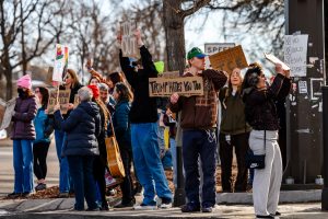 Protesters on the median of College Street hold signs in support of Minnesota and against ICE during an anti-ICE demonstration Jan. 30. The protest took up much of the intersection of College and Mulberry Street.