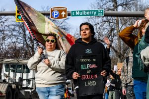 A protester holds a sign reading, “No One Is Illegal On Stolen Land,” during an anti-ICE protest on College Avenue and Mulberry Street Jan. 30.