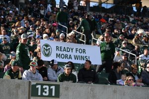 Two fans hold up a sign that reads “Ready for Mora wins!” in the stands of Canvas Stadium during Colorado State University’s football game against Air Force Academy Nov. 28. Jim Mora was announced as CSU’s new head football coach after the previous head coach, Jay Norvell, was let go midseason.
