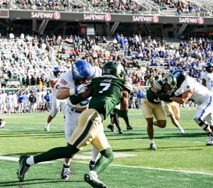 Colorado State University football defensive back Jake Jarmolowich (13) takes down Air Force academy quarterback Josh Johnson (11) during CSU’s last game of the season Nov. 28. Jarmolowich made eight total tackles during the game.