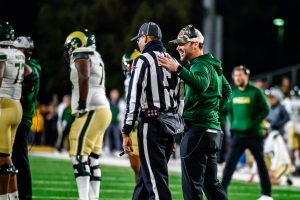 Colorado State University football interim head coach Tyson Summers talks to a referee during CSU’s game against the University of Wyoming Oct. 25.