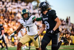 Colorado State University football wide receiver Tay Lanier (6) makes a run down the sideline while being pressured by a University of Wyoming defender Oct. 25. Lanier caught three passes and ran 56 receiving yards by the end of the game.