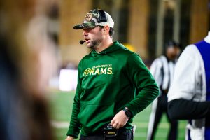 Colorado State University football interim head coach Tyson Summers walks off the field to talk to the team before halftime during CSU’s game against the University of Wyoming Oct. 25. Play calling duties were held by offensive coordinator Grant Chesnut for the game. “We will continue to get better,” Summers said. “We will continue to have a good attitude, we will continue to do the right things and we will continue to work.”