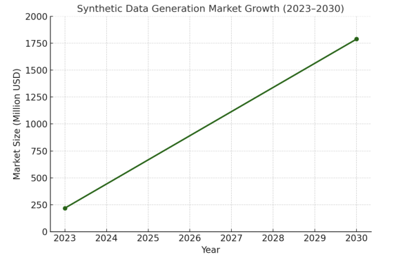 Understanding adoption is easier when looking at market trends. According to Grand View Research, the global synthetic data generation market was valued at approximately USD 218.4 million in 2023 and is projected to reach nearly USD 1.79 billion by 2030.