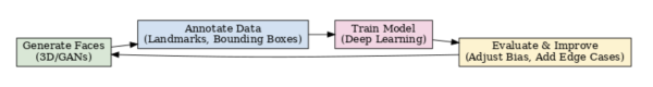 The lifecycle of a synthetic face recognition dataset describes the is a continuous process of generating, annotating, training, and refining artificial facial data to build robust machine learning models. It begins with data generation using techniques such as generative adversarial networks (GANs) or 3D modeling to create realistic yet privacy-safe faces. These images are then annotated with labels like facial landmarks, bounding boxes, and demographic attributes to make them suitable for supervised learning. The annotated dataset is used to train deep learning models, which are evaluated for accuracy, bias, and performance under diverse conditions. Based on evaluation results, the dataset is refined by adding new synthetic samples or adjusting distributions to address weaknesses, completing a feedback loop. This iterative cycle ensures that face recognition systems evolve with greater fairness, diversity, and robustness, while reducing reliance on sensitive real-world biometric data.